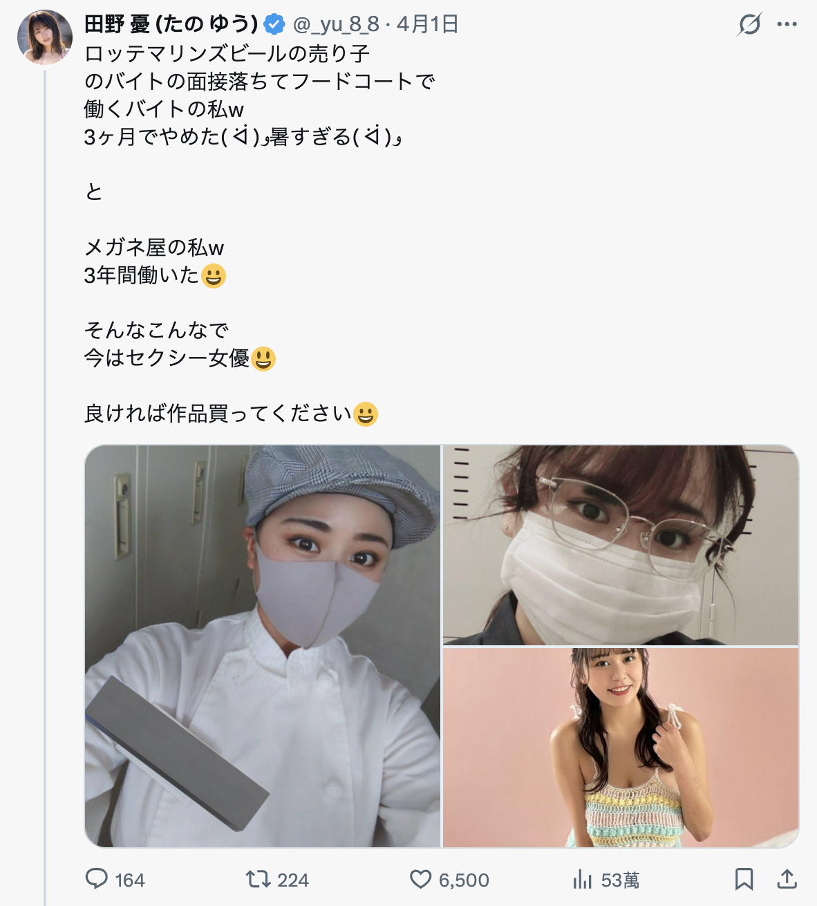 这位非常擅长做社群的女优是在前天、也就是4月1日时发文说自己在入行前曾经做过两个工作:第一个是去应征日本职棒千叶罗德海洋队主场走跳的啤酒妹结果落选了,然后就去美食街打工,不过只做三个月就辞职了ー理由是太热了,真的受不了;另外她也在眼镜行上过班,一共做了三年,后来经历了人生种种不同的转折后,现在,她是以「田野忧」的名字从事AV女优的工作: