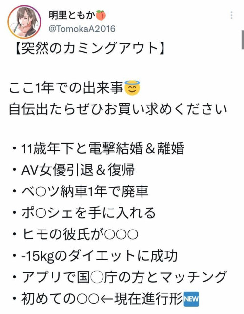 一度引退又复出的明里ともか(明里友香)就在twitter上疯狂爆料,先讲和钱没关系的事:她说在这一年间,她先和一个比自己小11岁的底迪结婚又离婚然后再复出拍AV,然后又交了个吃软饭的男友(后面她打了一堆圈圈所以我不知道后来发生了什么,但应该是分手了),在减重15公斤后她开始玩交友APP,结果钓到的是国税厅的官员,还有了第一次的「○○○」经验(一样没有说明):