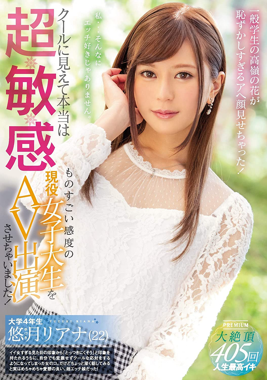 想在AV界生存下来有几个方法,如果不是长得超漂亮那你一定要有好身材,如果上述两者都没有的话那你一定要有能让影迷记住的演出:比方说很会吹、比方说很会奶交、比方说气垫上就是你必中的领域,而其中我觉得最有用的就是潮吹ー是,近年来对于潮吹的研究愈来愈多, 潮吹到底喷出来的是什么学有专精的博士可能解释到快翻白眼了,但那始终最吸睛的演出方式ー就凭着一碰就喷的敏感体质,悠月リアナ(悠月梨爱菜)甫出道便连续在Premium、本中、ナンパJAPAN以及kira☆kira,里面她角色多变,有时候是想被欧吉桑侵犯的变态辣妹、有时候是让运动员流口水的赛车皇后(其实她不高只有154公分,有这企划真神奇),当然也免不了演出最适合她的六本木第一酒店妹:
