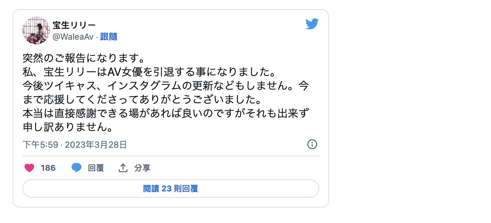 除了离开AV界,宝生リリー(宝生莉莉)也说未来不会再更新twitter及IG,只是因为无法举办活动向粉丝们面对面表达感谢之意,所以她只能借着这篇引退文感谢大家长久以来的支持⋯