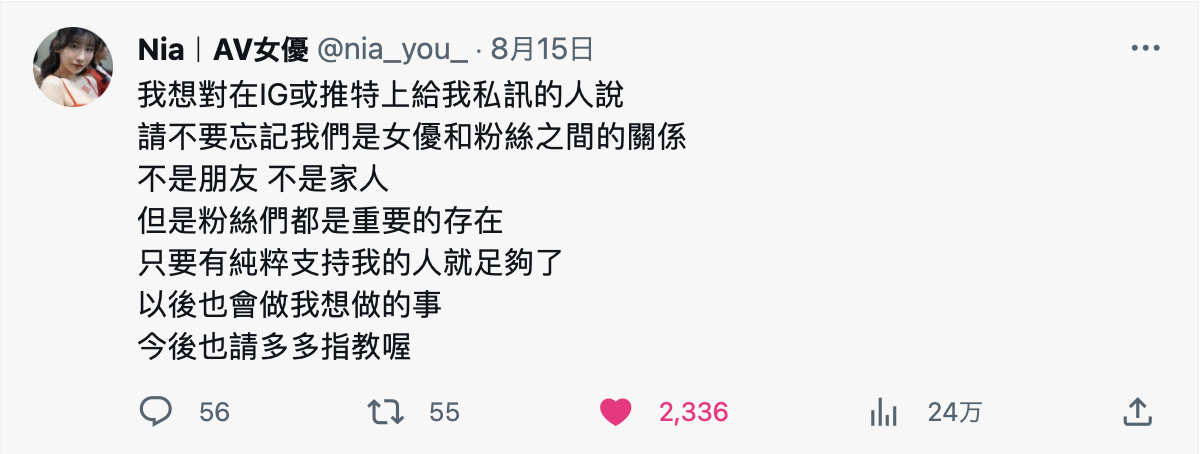第一篇的意思应该是Nia觉得如果是讨厌的事那就直接了当地说出来,她无法理解为什么要为了流量而忍耐?第二篇就不用我解释了,Nia是提醒私讯她的朋友双方的关系就是女优与粉丝,她很珍惜粉丝,但请大家不要逾越这个关系⋯