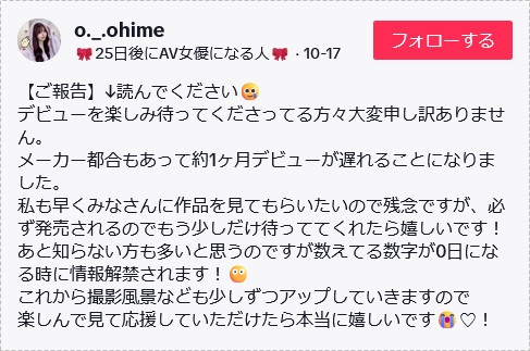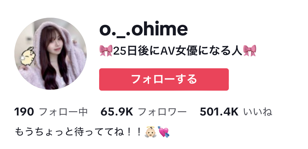 是的,她已经有5.3万个追踪,很多出道一两年的新人还没那么厉害呢;但她的Tikotok更猛(https://www.tiktok.com/@o._.ohime),目前有超过6.5万人追踪ー至于她是谁、大家为什么期待她下海呢?这可不是大家看到一个女生就胡乱许愿希望她去拍A片,而是她自己在Tiktok自我介绍栏告诉大家她就是个「25日后にAV女优になる人」(25天后要出道当AV女优的人):