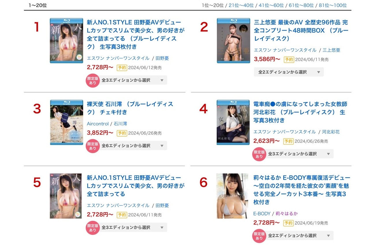 没没没,千万不要因为她掉了一名就觉得不行了,河北彩花的销售能力仍然是业界最顶尖的高手,新片「电车痴汉の虏になってしまった女教师」仍然拿下了第四,然后连男优全员连射的「1発の射精では満足できないくらい官能的で贪欲なセックスをー。」的蓝光片也打进了前20名,DVD则是第36名,这种成绩一般女优根本望尘莫及的,只能说河北就是河北,能赢她的石川也不是普通高手〜