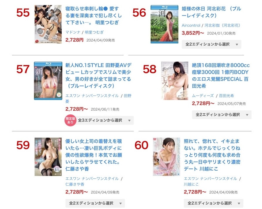 坦白说,我无法解释这个现象,你说河北会输艺能人会输顶级新秀我都可以接受,说她最卖座的片子是写真片也不是不行,但是,BUT,就算她入榜的作品还不少,但上半年度最卖的作品是56名起跳实在太不寻常惹!
