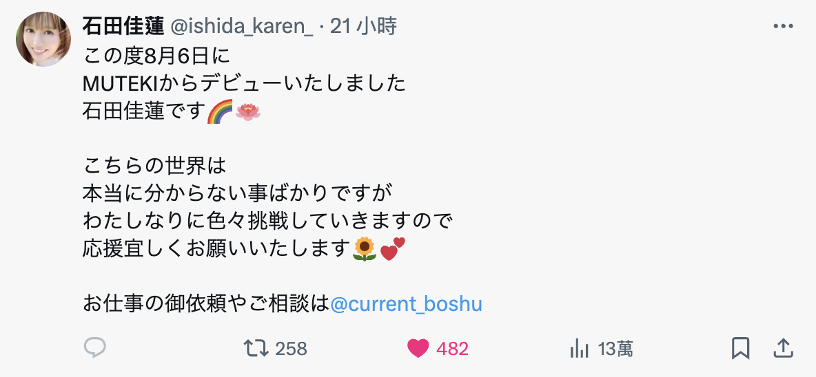 首先,她有社群了,请大家追踪她的X帐号(https://x.com/ishida_karen_),也透露了事务所是ライト(LIGHT),这也是这个事务所系统第二位在Muteki出道的艺能人(另一位是乃々果花);而除了LIGHT这间经纪公司,石田佳莲还另外成立了一间合同会社カレント(https://x.com/current_boshu)打理自己的工作,这代表她和LIGHT是业务提携相互合作的关系,LIGHT负责处理AV出道的事宜,你要找她合作活动可以找LIGHT也可以直接私讯她成立的那间合同会社カレント⋯