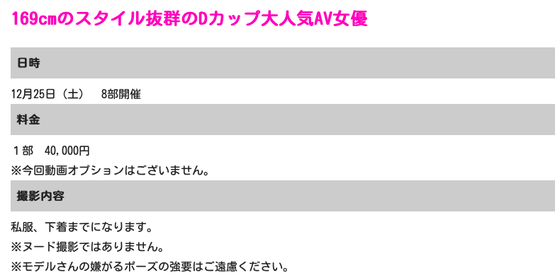 她只有木下一半的价格(20000円,5000台币),而且可以フルヌード(全裸)、然后ボーズフリーOK(Pose Free OK),也就是说除非你叫她学空条承太郎做一些违反人体工学的姿势或是一些会让人觉得很噁烂的动作不然你要她怎麼做都行,由於现在女优下马的比例远不如从前,所以参加这样的摄影会就可以让你成為少数看过女优鲍鲍还用照片纪录下的性运儿,爽啦!