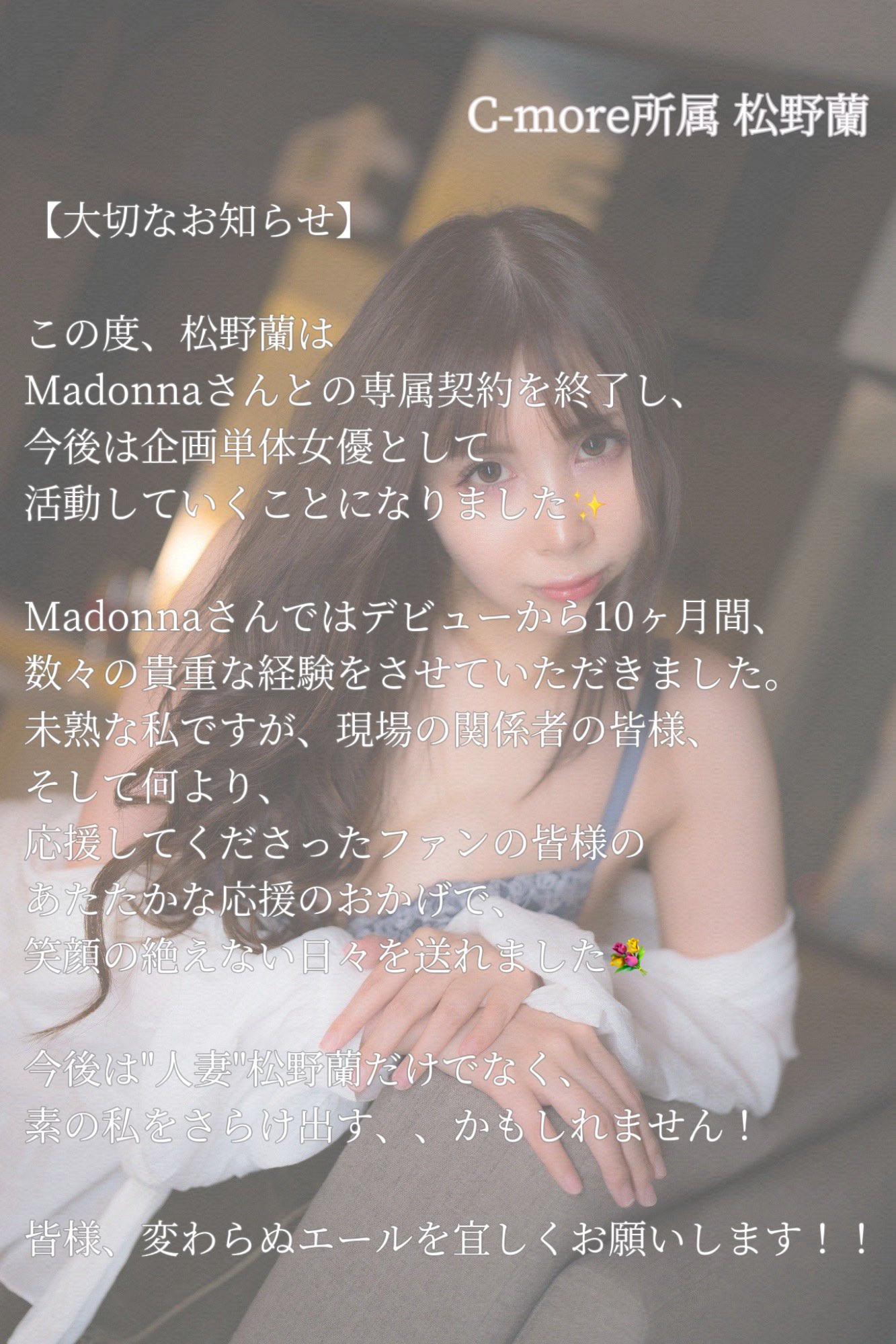 公司C-更多附属的女优「松野兰」是在5月21日的时候发文,说自己「専属契约终了」、结束了与人妻片商麦当娜专属的合作关系;接下来呢?