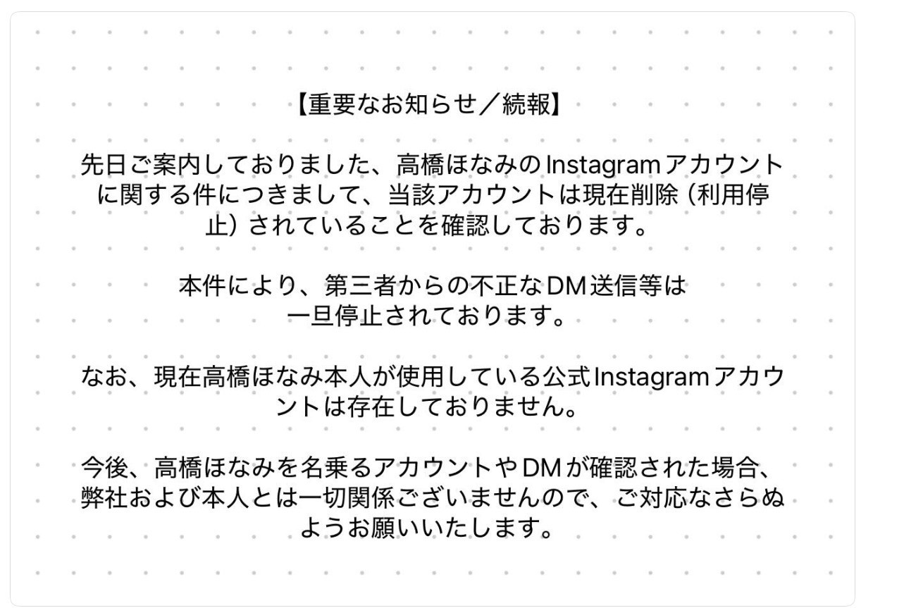 然后过了好一阵子,经纪公司再度发文,说高桥ほなみ(高桥保奈美)的IG帐号已经删掉了,然后目前本人已经没有在用任何的IG帐号,所以任何使用高桥ほなみ(高桥保奈美)名义的IG帐号都跟女优及其经纪公司无关,特此声明。