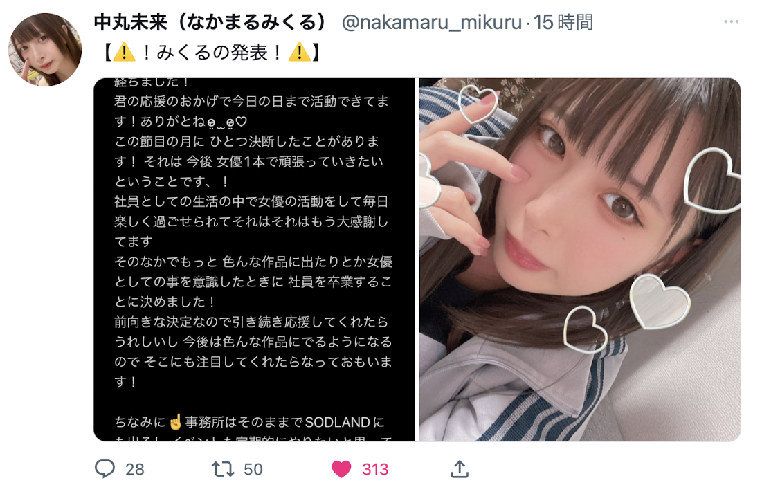 SOD饮食事业部出身、号称之前曾经当过偶像的「中丸未来(中丸未来)」在twitter宣布离职不当女子社员了,接下来呢?嗯,没错,你猜对了,出道一周年的中丸未来觉得腿张开比较好赚,所以她决定专心当个AV女优!